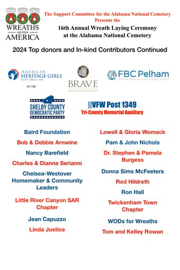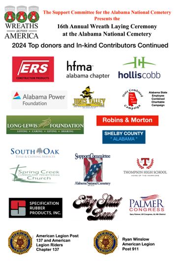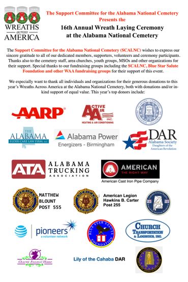 With fundraising support from the Support Committee fundraising group, Blue Star Salute Foundation fund raising group, military services organizations, companies, retiree groups, and other charitable organizations; Wreaths Across America (WAA) has become the largest event of the year at ALNC and one of the largest (attendance) holiday season events in the area.The 16th Annual Wreaths Across America Ceremony is scheduled for Saturday December 13, 2025 at 11:00 a m at the Alabama National Cemetery. Information on how you can volunteer will be posted on our blog and Facebook page.