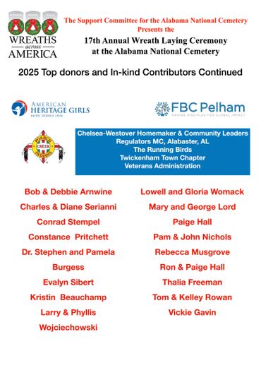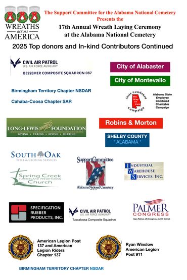 With fundraising support from the Support Committee fundraising group, Blue Star Salute Foundation fund raising group, military services organizations, companies, retiree groups, and other charitable organizations; Wreaths Across America (WAA) has become the largest event of the year at ALNC and one of the largest (attendance) holiday season events in the area.The 18th Annual Wreaths Across America Ceremony is scheduled for Saturday December 19, 2026 at 11:00 a m at the Alabama National Cemetery. Information on how you can volunteer will be posted on our blog and Facebook page.
